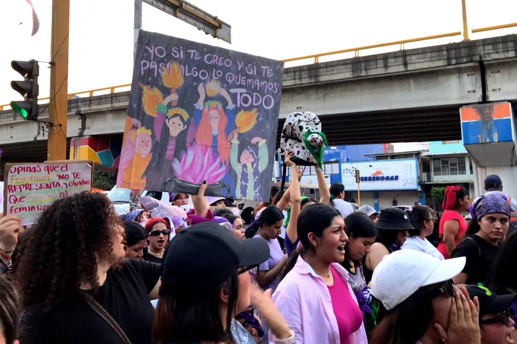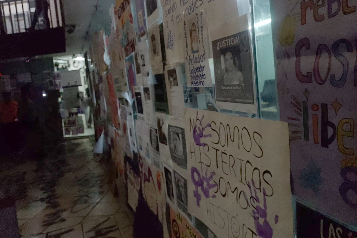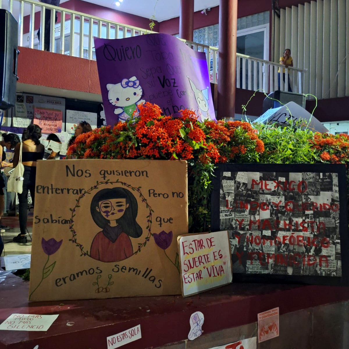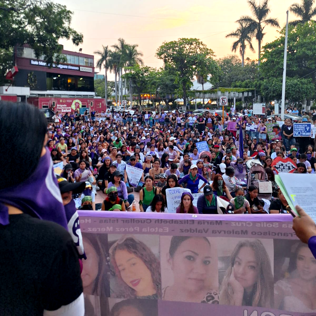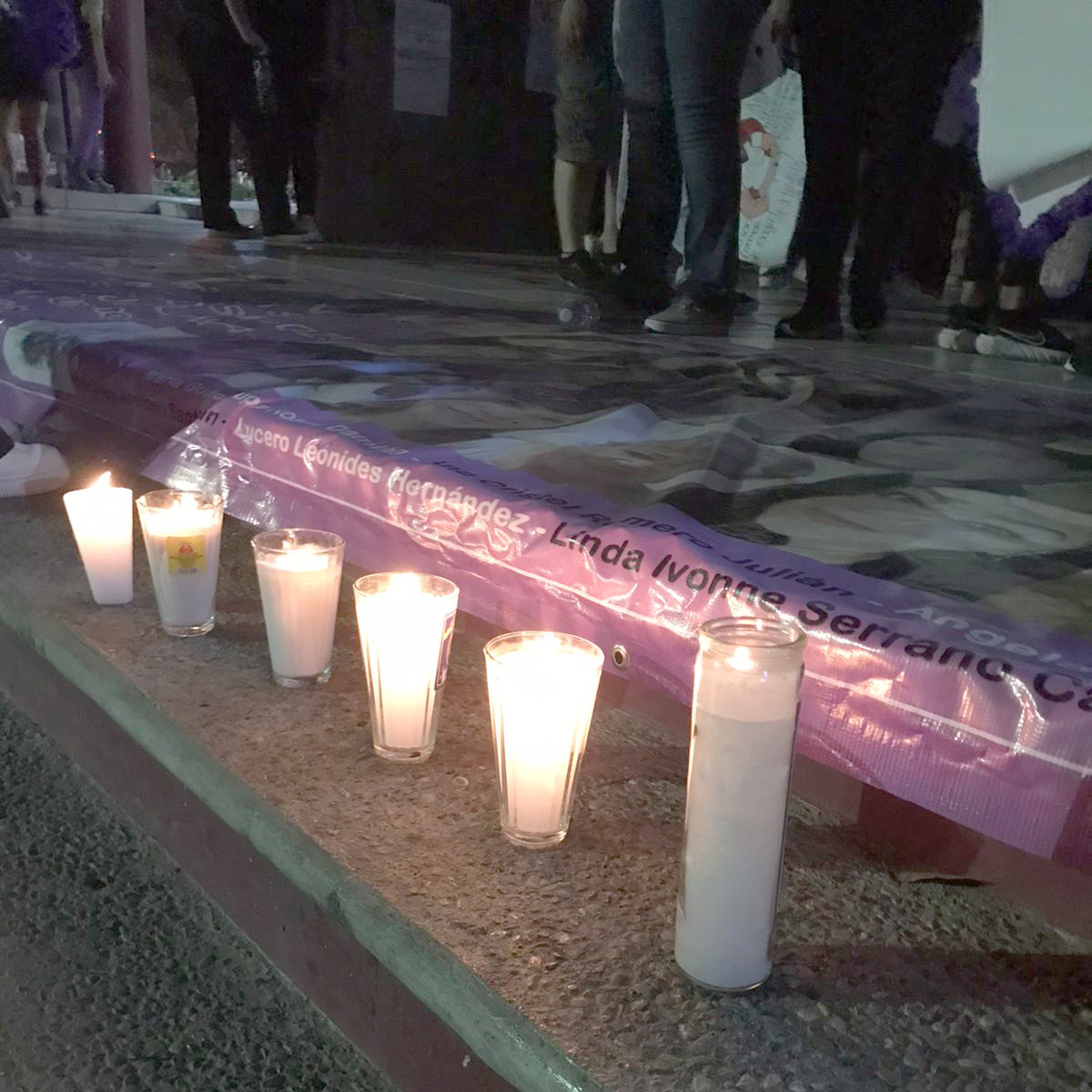 Sentimientos encontrados al escuchar el pase de lista y el canto a una sola voz de «Canción sin Miedo» de Vivir Quintana. Posteriormente, procedieron a colocar lo que ellas llaman: el tendedero de acosadores, agresores y deudores alimenticios, para exigir la justicia que se les ha negado.